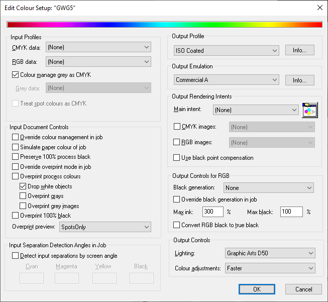 - Make sure that Output Emulation is set to any value other than (None); the actual value selected will be overridden with the profile from the output intent.