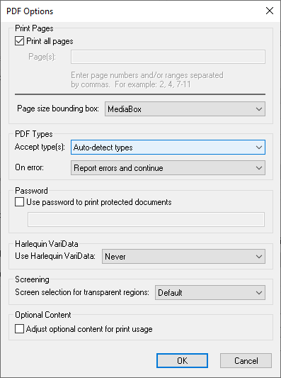 - If any spot colors in the PDF file are to be emulated using process colors in the output from the RIP, then you should also set Overprint preview to “SpotsOnly”. This is not necessary if separations are to be produced for all spot colors used in the PDF file. Older versions of the Harlequin RIP only had a check-box for Overprint preview rather than a drop-down menu; in this case, check the box.