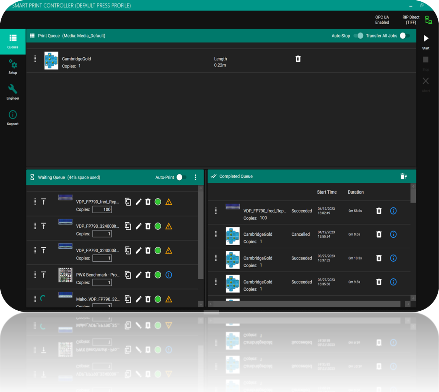 Experience the power of a fully customizable Digital Front End (DFE) that adapts to your brand requirements. This solution provides a seamless entry into the market, enabling swift integration. Operating in server (headless) mode, it also effortlessly complements your existing front end setup. Seamlessly integrate with Smart Print Controller (SPC) through the OPC UA API, enhancing connectivity.